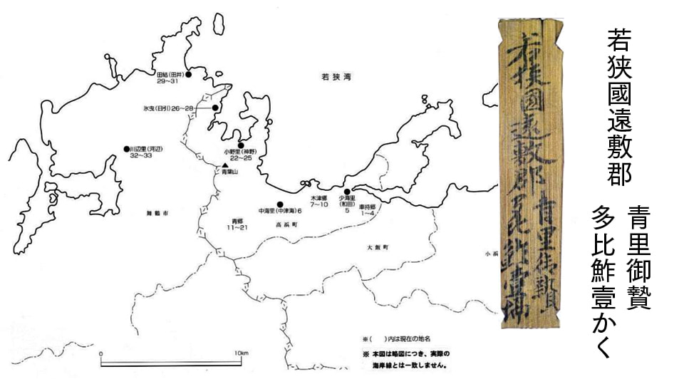 昭和35年、奈良の平城宮跡から出土した大量の荷札木簡(荷物を送るときにつけた荷札 )『贄札(にえふだ)』の中に「若狭國遠敷郡青里御贄多比鮓壹かく」と記されたものがあることを、昭和38年に当時の国立奈良文化財研究所が発表しました。これは、若狭国遠敷郡青の里(現在の高浜町青郷地区)より、多比鮓(鯛のすし)を献上したことを示すもので、現在まで「すし」を記した日本最古の現物資料とされています。若狭の出土木簡の多くが高浜町のものであることから、高浜町がこの時代の若狭の中心地であったことも推測できます。