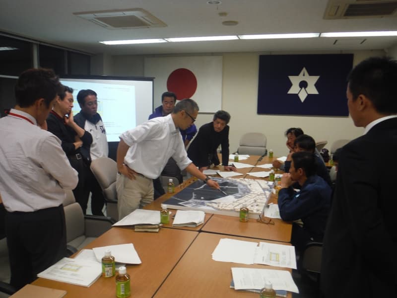 今回の勉強会では塩土地区に漁港施設を集約した場合のイメージをつかむため、漁港周辺の模型を用いて意見交換を行いました。