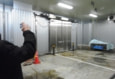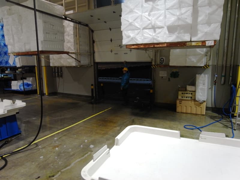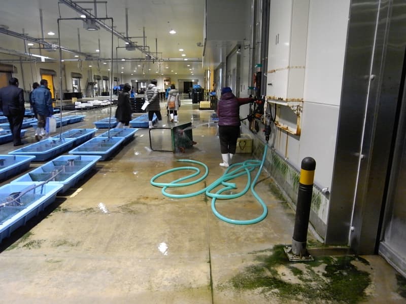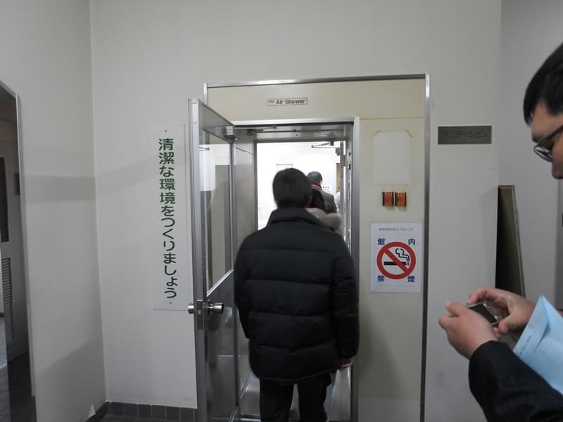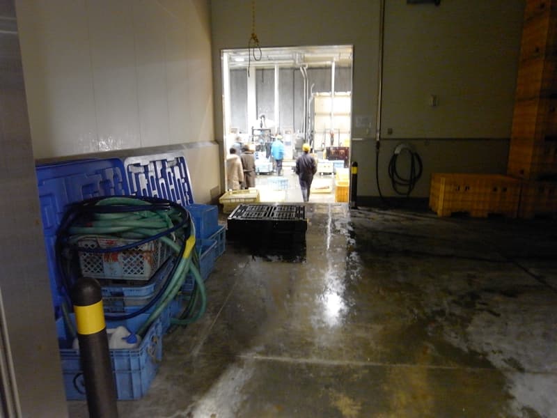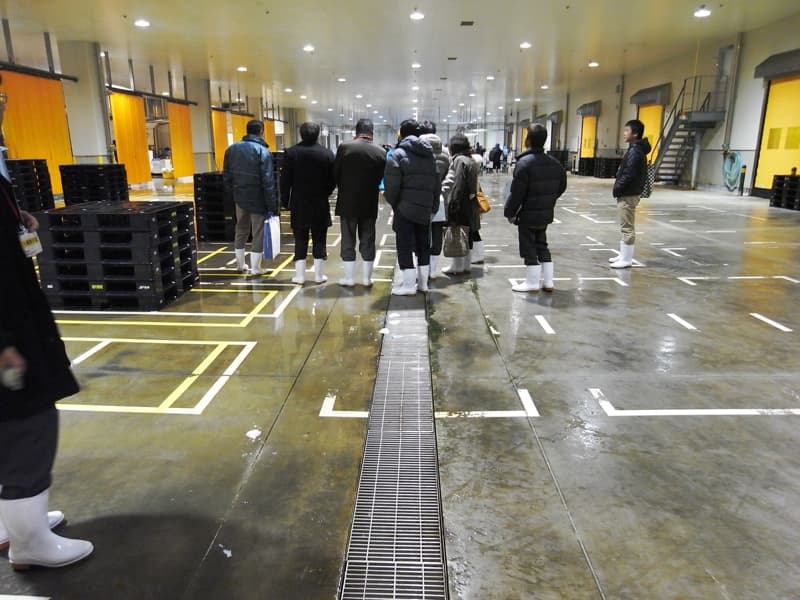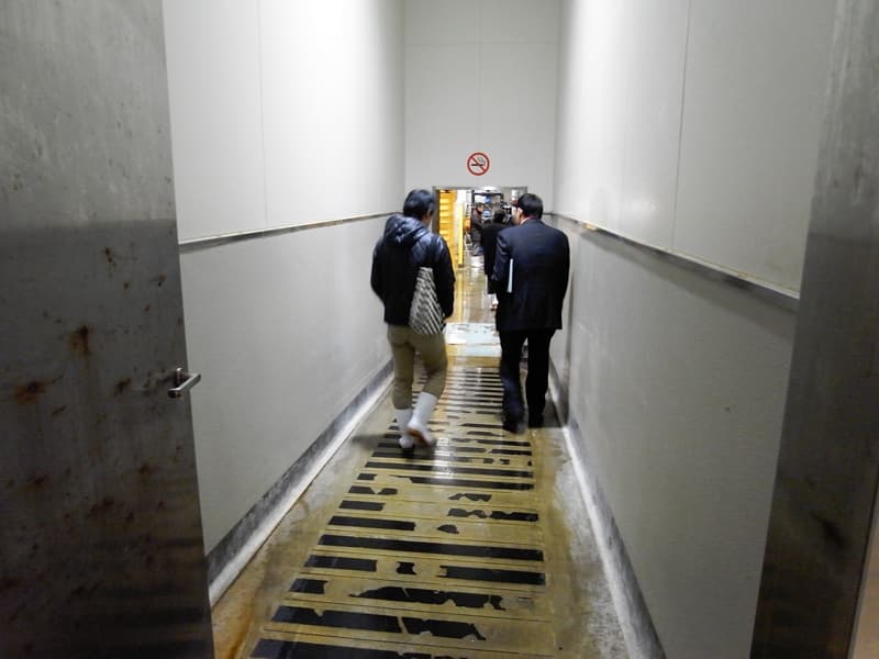 競り場で働く従業員もエアーシャワー室を通り、手や長靴を洗浄して入る。