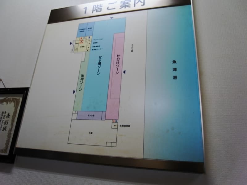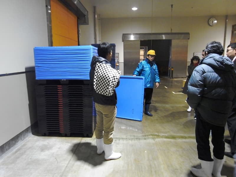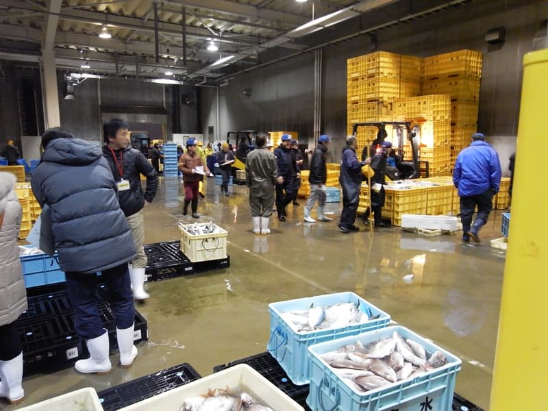 魚津漁業協同組合の協力により、全国に先駆けた高度な衛生管理型荷捌き施設を見学し、そこで施設の内容や実際に行われているセリの状況、従業員や仲買人の導線について説明を受けた。