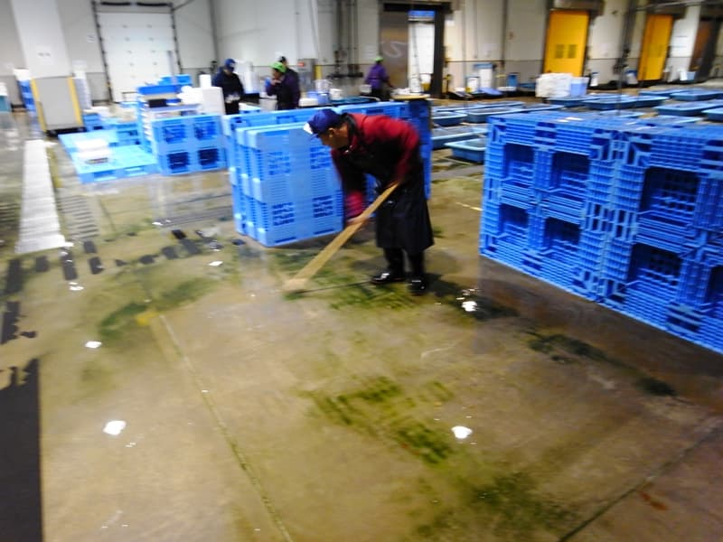 セリ場は、プラスッチク製のトレイで魚を直接床に置くのではなく高床式にしており、運搬車などは仕分けゾーンヘの乗り入れが禁止されている。また、屋内・屋外運搬機器も完全に分離している。
