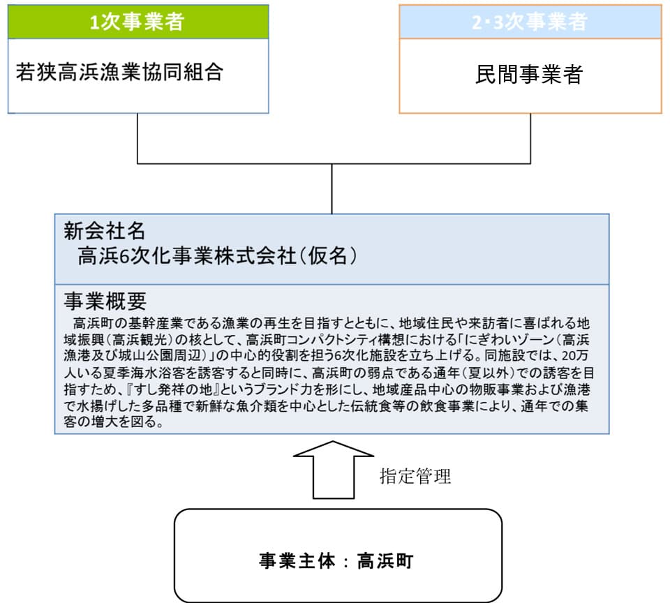 六次産業施設の運営体制の構築 高浜町の基幹産業である漁業の再生を目指すとともに、地域住民や来訪者に喜ばれる地域振興の核として計画を進めてきた6次産業施設については、高浜水産業振興協議会における魚商組合を中心とする6次産業勉強会において、検討を重ねてきており、平成28年度においては、基本設計を策定することが出来た。 今後、6次産業施設の構築を推進していくうえでは、実際に運営する会社の設立に向けた検討を行い、運営面や人材面、採算面など更に詳細に検討していく必要がある。