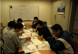 前回と同様に荷捌き場、漁協施設、6次産業施設のレイアウト案を基に協議をおこないました。施設配置についての意見としては、「6次産業施設の売り場面積を減らしてでも駐車場を多く確保したい。」「塩土区側からの歩行者や自転車での利用者のアクセスについても検討が必要だと思う。」などがありました。直売施設の運営については、「テナント方式でやる場合に夏場は出店する人もあると思うが、通年となると難しいかもしれない。」「雑魚のブランド化や活魚の販路拡大などは組織全体で協力していく必要がある。」などがありました。