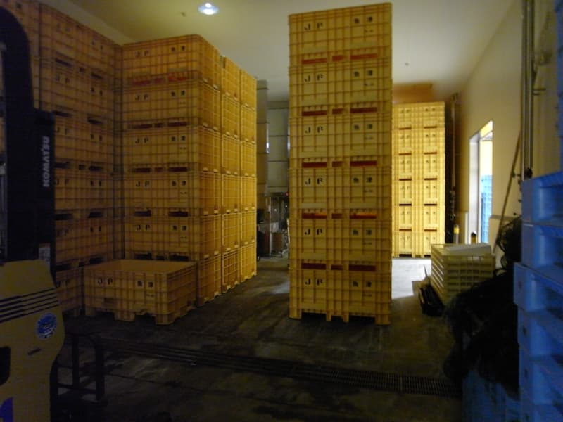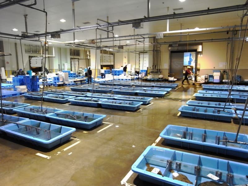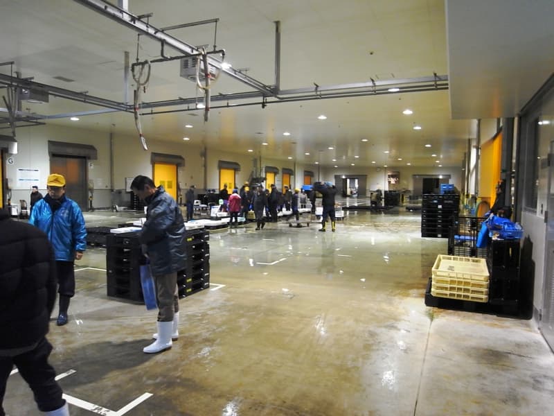 セリ場は、プラスッチク製のトレイで魚を直接床に置くのではなく高床式にしており、運搬車などは仕分けゾーンヘの乗り入れが禁止されている。また、屋内・屋外運搬機器も完全に分離している。