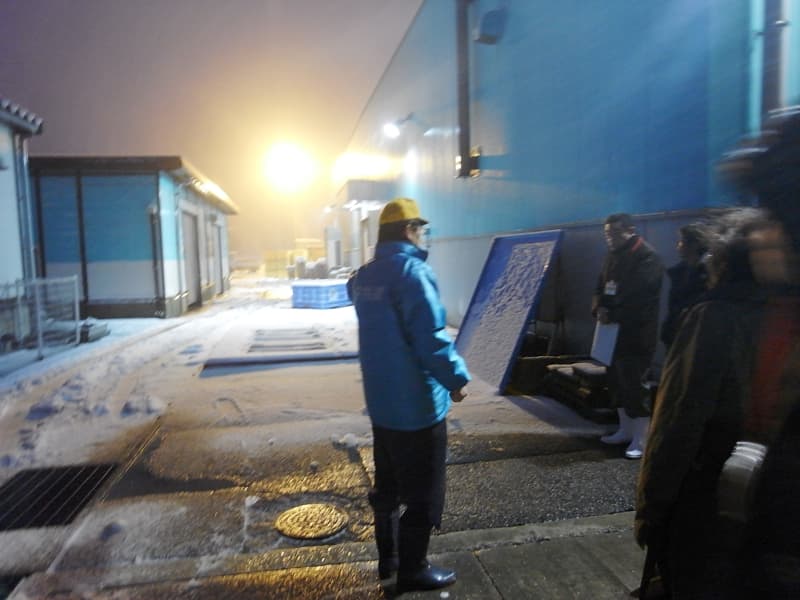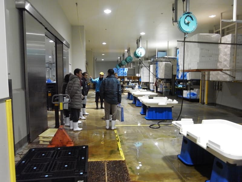 魚津漁業協同組合の協力により、全国に先駆けた高度な衛生管理型荷捌き施設を見学し、そこで施設の内容や実際に行われているセリの状況、従業員や仲買人の導線について説明を受けた。